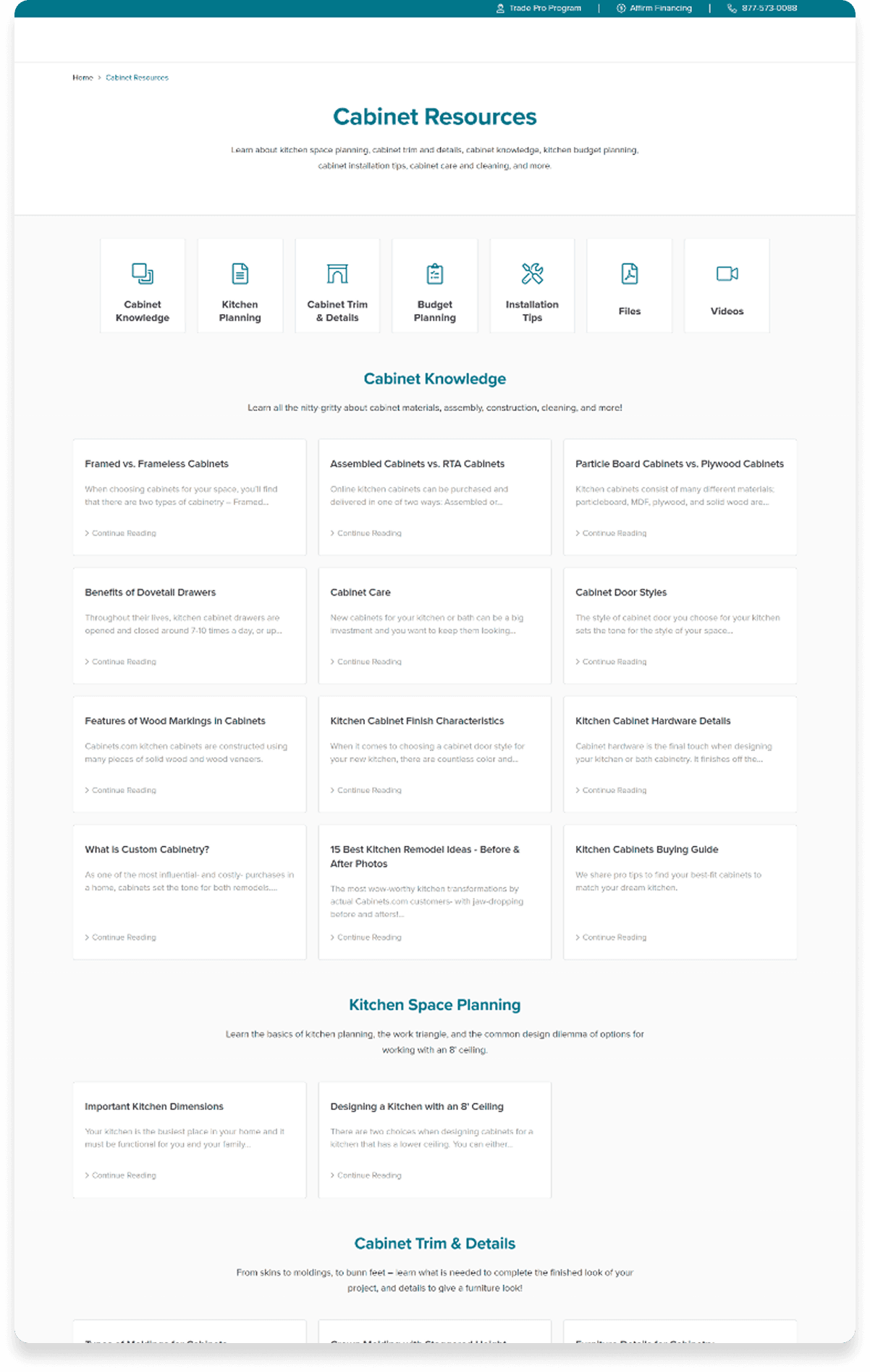 If we create a centralized cabinet resources page with articles, visual guides, and contextual help, customers will gain the knowledge they need to make informed decisions. This will reduce confusion, lower support requests, improve SEO traffic, and ultimately drive higher conversion rates by positioning Cabinets.com as both a retailer and a trusted expert.